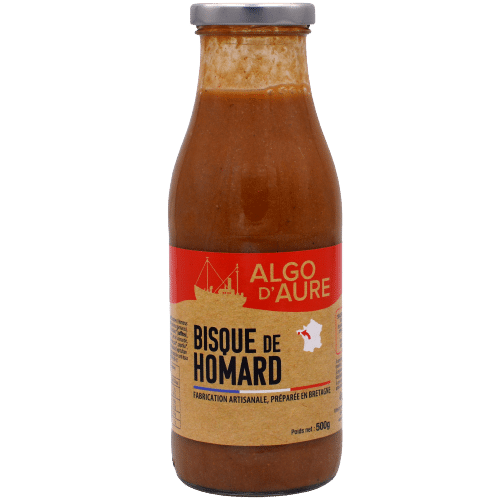 Composition : Eau, poissons, homard Européen (Homarus gamarus) 13,5%, extrait de homard (Homarus gamarus), tomates*, crème*, oignons*, carottes*, vin blanc* (sul_tes), poireaux*, amidon de maïs*, beurre*, sel de Guérande, Cognac*, épaississant : farine de graine de guar*, paprika*, poivre*, ail*, laurier*, thym*.